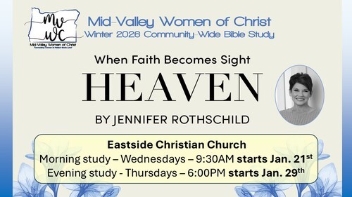 Our winter women's Bible study will be "Heaven - When Faith Becomes Sight". In this 7-session video-based study, Jennifer Rothschild explores the subject of Heaven from a biblical perspective. She will separate what’s true about Heaven from what’s based on legend, media depictions, and hopeful guesses. The Wednesday morning at 9:30am study will begin January 21st. The Thursday evening at 6:00pm class will begin January 29th. Registration for these classes is now open at www.midvalleywomenofchrist.org