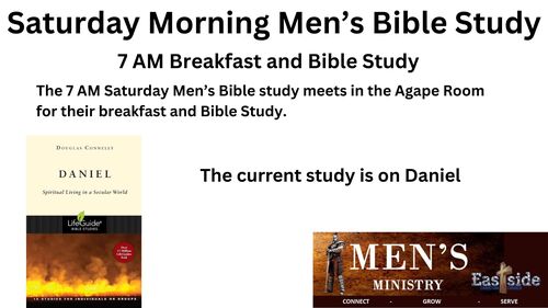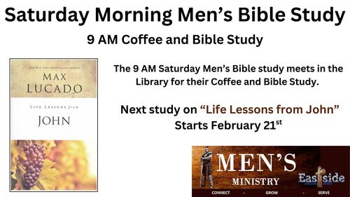 We have two Men's Bible Studies that meet on Saturday Mornings at 7am with breakfast in the Agape Room and 9am with coffee in the Library.