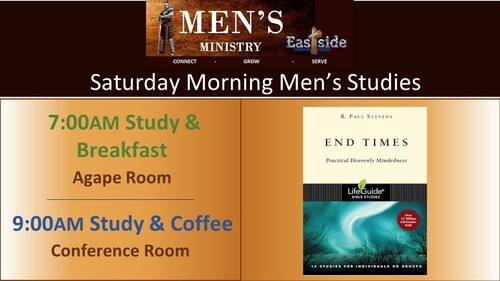 We have two Saturday morning bible studies. One at 7AM which includes breakfast. As well as a 9AM group which serves coffee. All are welcome to join.