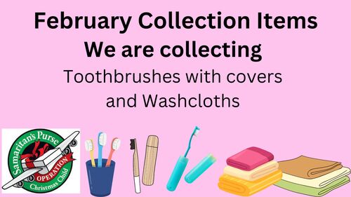 Donation of items are collected year round. Guest services has a list of items needed. Eastside packs the boxes in Nov. and usually ship more than 400+ boxes to children around the world.